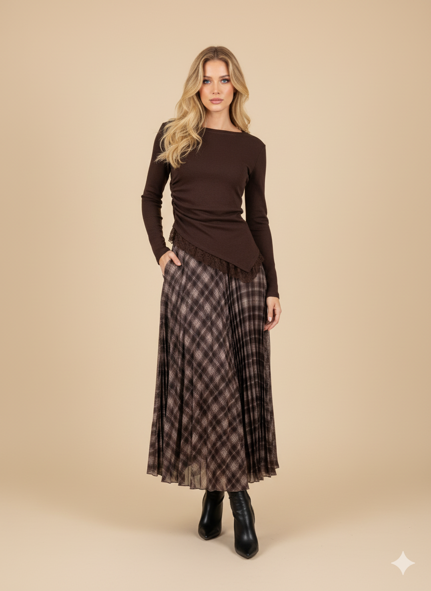 Camiseta de punto con puntilla de encaje con un tallaje único desde la 36 a la 40 en marrón chocolate