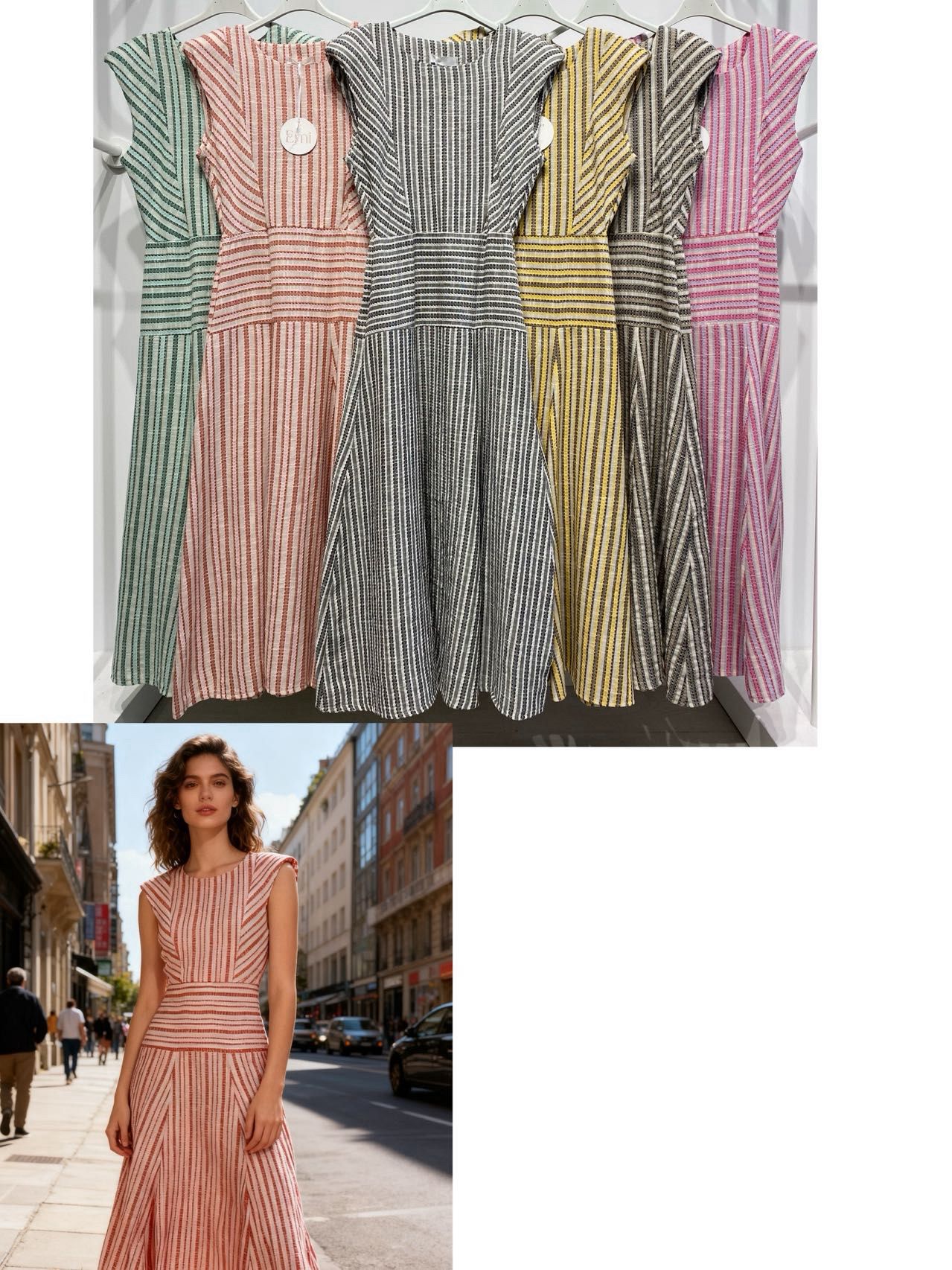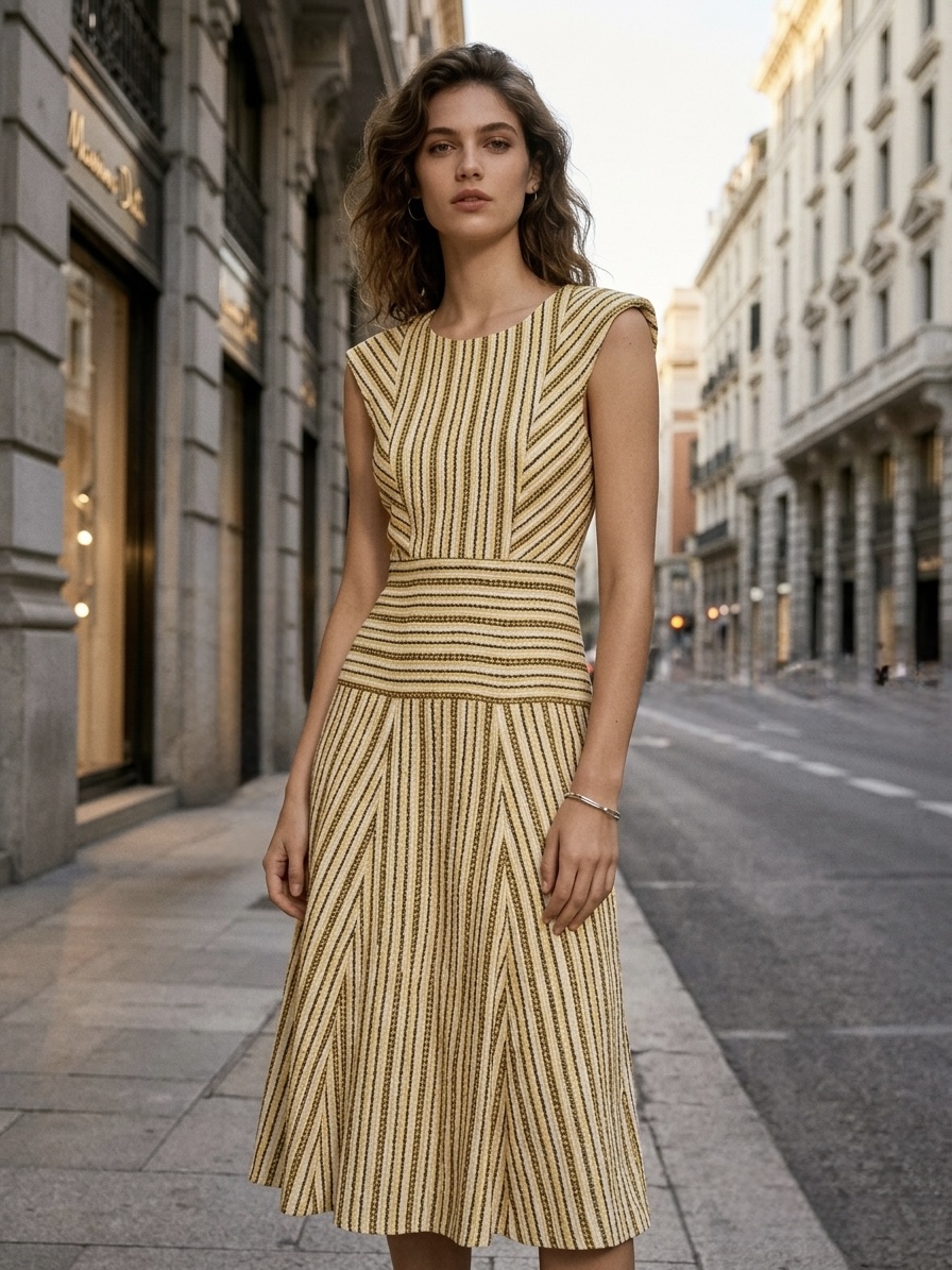 Vestido con hombreras y un tejido como bordado y un tallaje desde la 36 a la 44